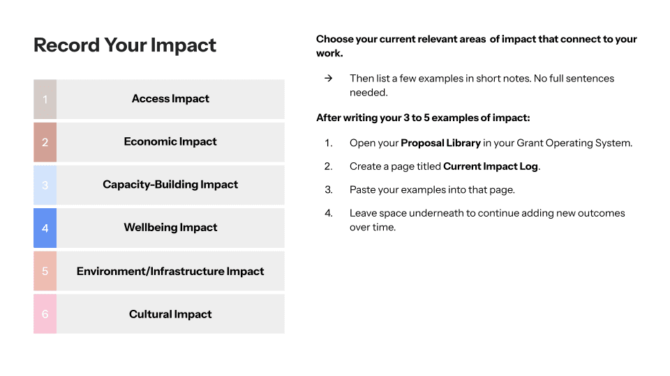 Once your impact log is in place, you'll learn how to pull from it directly when writing proposals. Funders assess your past results to predict future performance. Your log becomes the evidence they need to say yes.