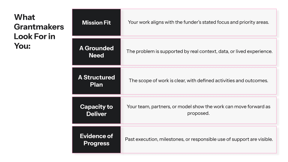 This lesson covers the core signals grantmakers evaluate when reviewing applications. These elements reveal whether your work is ready for support and positioned to succeed.