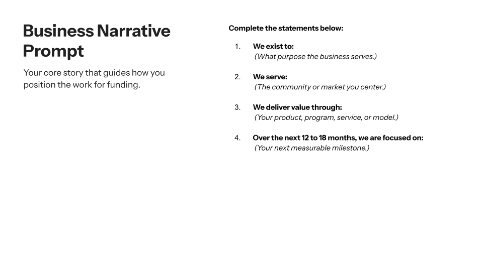 A business narrative is the organizing story of your work. It captures your intention, your audience, and the outcomes you're building toward. A clear narrative makes every other piece of your funding strategy easier to execute. Your proposals become more consistent. Your decisions feel more aligned. Funders grasp your direction faster.